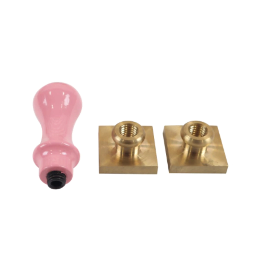 El set de 3 piezas, Contiene 2 sellos de bronce para estampar en cera (motivo estampilla ramita y estampilla mariposa) y un mango de madera laqueado en color rosa, universal, con punta a rosca.